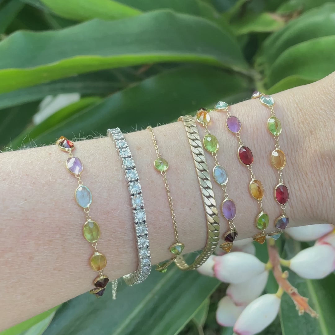 Our gold bezel set oval rainbow bracelet features Amethyst, Blue Topaz, Citrine, Garnet, and Peridot. The perfect rainbow to brighten any wardrobe to be layered or worn on its own. This bracelet can be worn 6, 6.5, or 7 inches.
