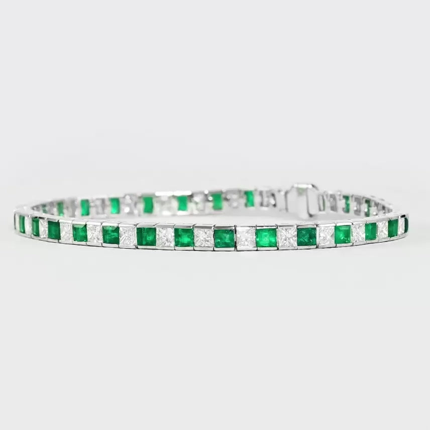 Presenting the Princess Cut Diamond and Emerald Tennis Bracelet, a majestic creation from Aurum Stories. This breathtaking bracelet features a sleek chanel set tennis bracelet adorned with alternating princess cut diamonds and vibrant emeralds, showcasing the ultimate blend of luxury and sophistication. Each diamond is expertly cut to maximize brilliance, while the emeralds radiate a deep, rich green hue. This stunning tennis bracelet is a true masterpiece, perfect for making a statement at any occasion. Experience the epitome of elegance with the Princess Cut Diamond and Emerald Tennis Bracelet, expertly crafted by Aurum Stories.
