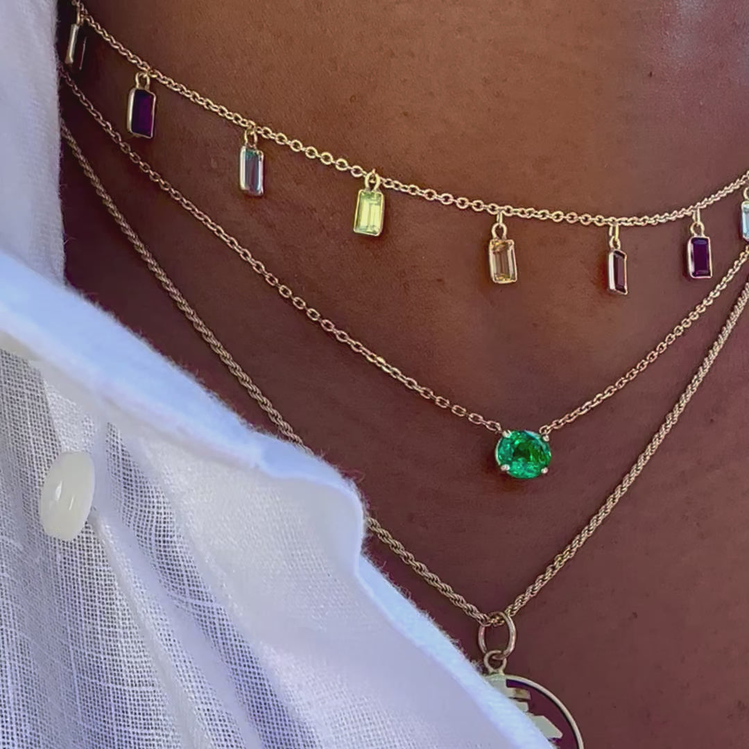 The ultimate layering necklace, our emerald cut rainbow choker necklace will always be a modern classic. Featuring Amethyst, Blue Topaz, Citrine, Garnet and Peridot. It will always be a best seller looking incredible on its own or paired with others, can be worn at 14, 15, or 16 inches depending on the look.