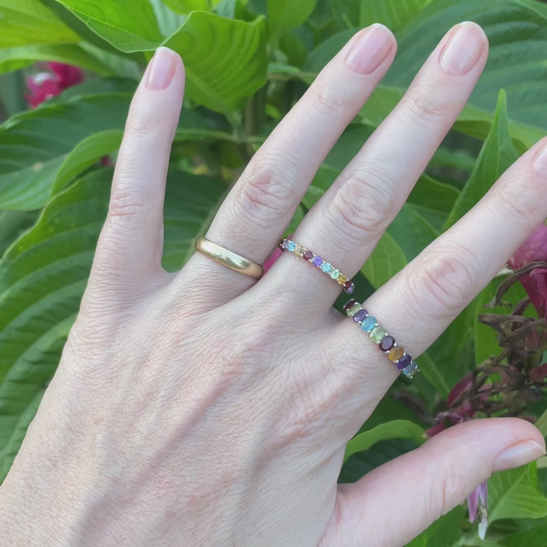 Looking for the perfect pop of colour? This gold multicoloured eternity band features beautiful round brilliant Amethysts, Citrines, Peridots, Blue Topaz and Garnets. It is perfect on its own or stacked.