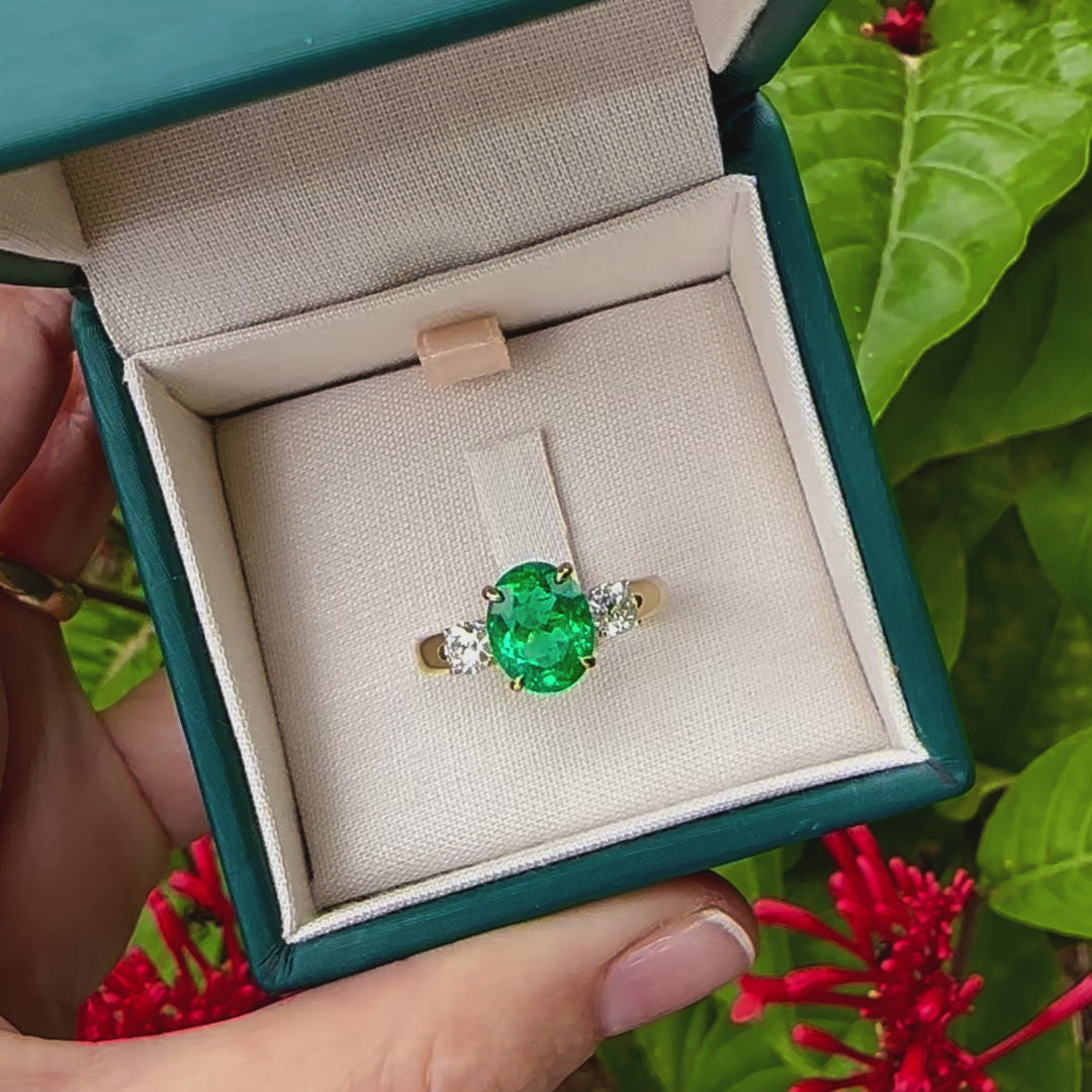 This rare untreated Zambian Emerald with perfectly proportioned Round Brilliant Diamond side stones.